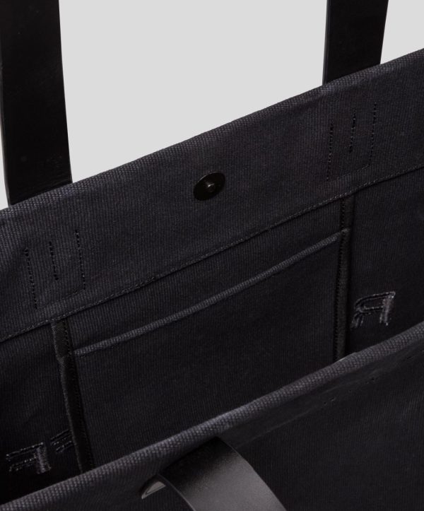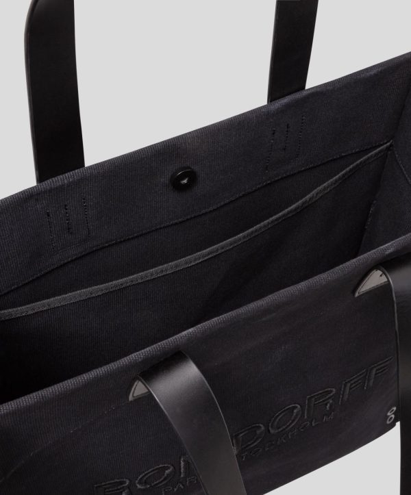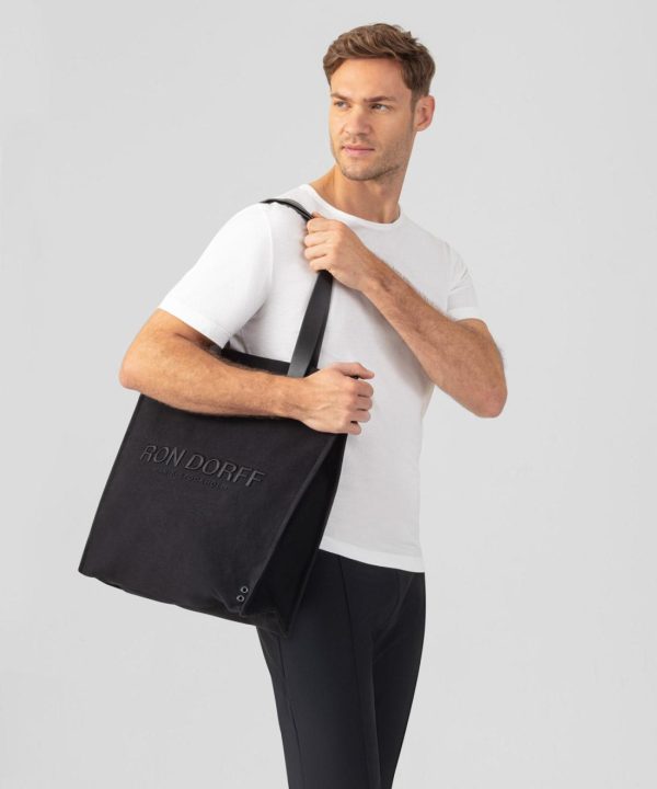 To accompany you on all your urban travels, this new bag will be ideal while combining practicality and elegance. It’s made from thick coated canvas with tone-on-tone “RON DORFF” relief embroidery on one side. The handles are in leather and it closes with a matte black metal magnetic button. Inside, a compartment for your computer and a small pocket for more precious items. Dimensions : 43cm x 40cm x 14cm.