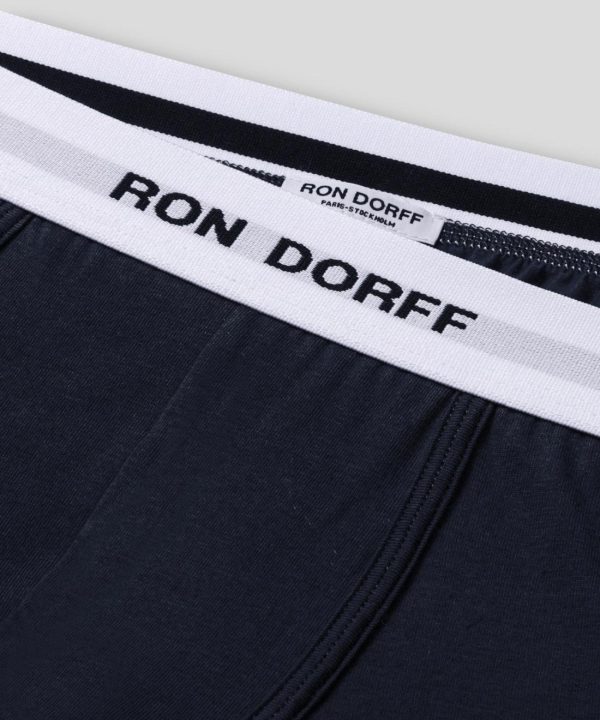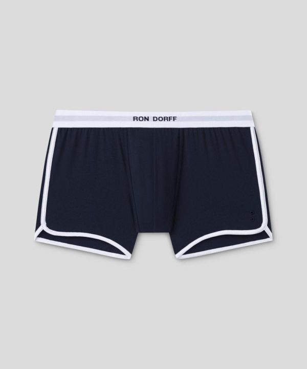 The new boxer briefs RON DORFF in its sporty version, inspired by marathon shorts, with a visible, white, elastic waistband branded RON DORFF in black. Designed with a tapered fit and cut in the finest cotton jersey with a hint of elastane for a guaranteed fit wash after wash. The two discrete, RD eyelets embroidered tone-on-tone on the side.