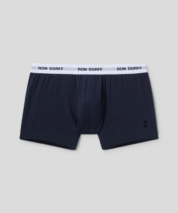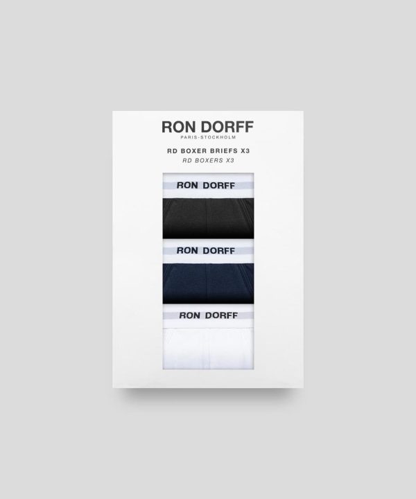 The new boxer briefs RON DORFF with a visible, white, elastic waistband branded RON DORFF in black. Designed with a tapered fit and cut in the finest cotton jersey with a hint of elastane for a guaranteed fit wash after wash. The two discrete, RD eyelets embroidered tone-on-tone on the side. Come exclusively in a Weekend Kit containing 3 briefs – one black, one white and one navy.