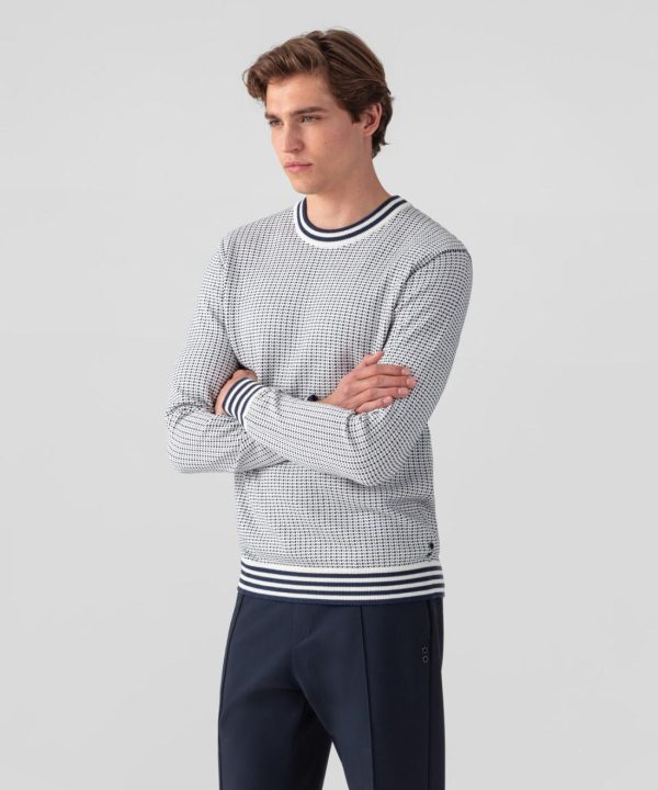 The classic Nordic sweater revisited, crafted from an ultra-soft blend of cotton and silk, and featuring a mini Nordic pattern. Ribbed finishes at the cuffs and hem ensure a clean, structured fit. Featuring the two discrete black-lacquered RON DORFF eyelets on the side.