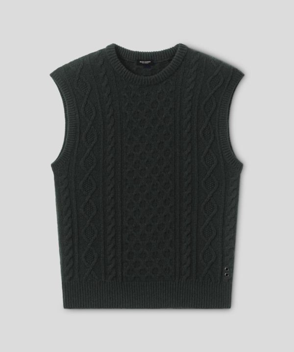 The new Nordic Telemark sleeveless sweater with traditional cable-knit. Crafted in a premium mix of high-quality wool and the finest cashmere for a warm and ultra-comfortable feel. Featuring the two discrete black-lacquered RD eyelets on the side.