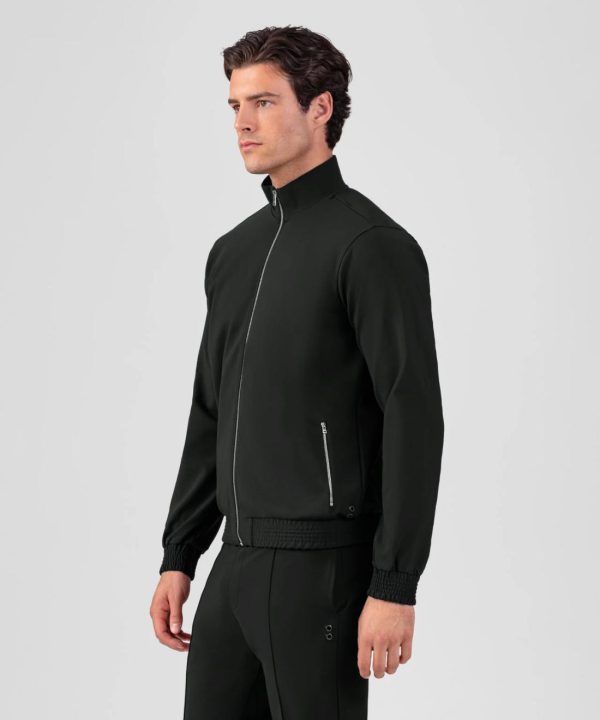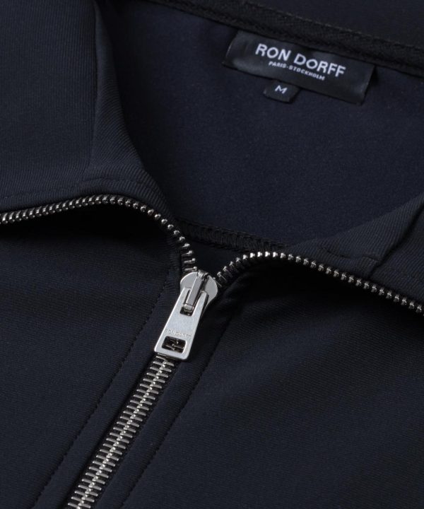 The classic zipped tennis jacket revisited for chic city wear and ideal for mid-season days. Upgraded in an ultra-resistant, interlock piqué made in a high-tech mix of light nylon and spandex. Designed with a slightly tapered fit, zipped side pockets and finished with ribbed cuffs, waistband and collar. Swiss-made anti-tear zip with RON DORFF engraved puller. Featuring the double black-lacquered RD signature eyelets.