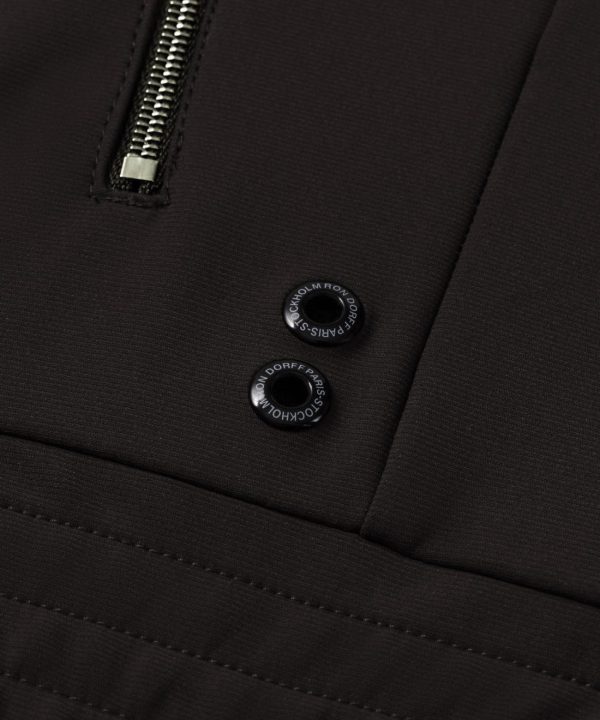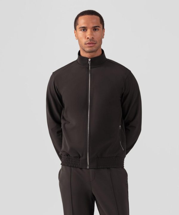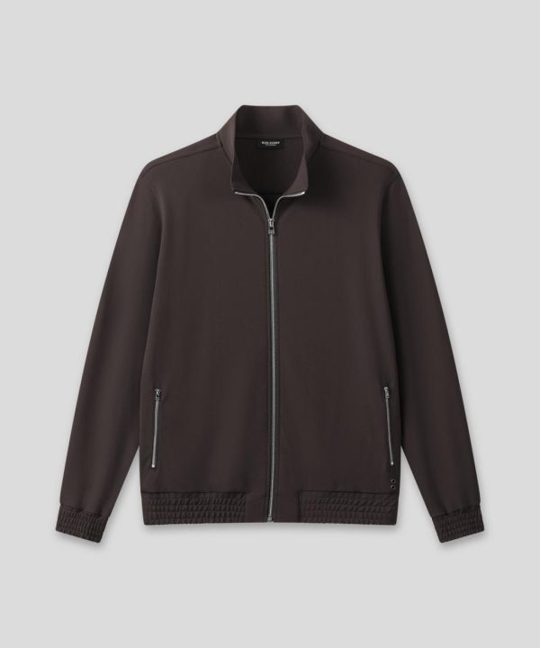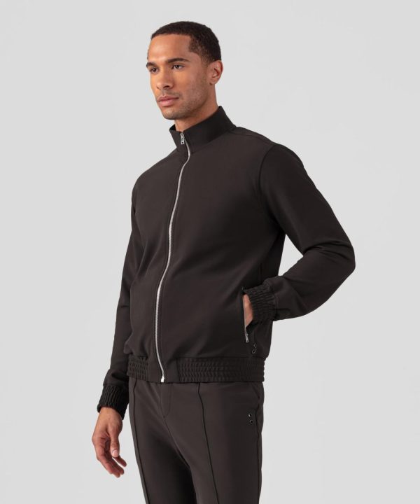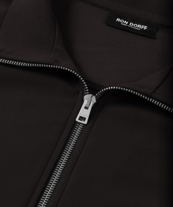 The classic zipped tennis jacket revisited for chic city wear and ideal for mid-season days. Upgraded in an ultra-resistant, interlock piqué made in a high-tech mix of light nylon and spandex. Designed with a slightly tapered fit, zipped side pockets and finished with ribbed cuffs, waistband and collar. Swiss-made anti-tear zip with RON DORFF engraved puller. Featuring the double black-lacquered RD signature eyelets.