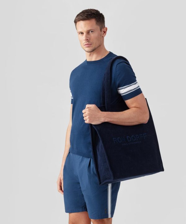 To accompany you in the beach, this new bag, in a ultra-soft terry cloth, will be ideal while combining practicality and elegance. It’s made from thick cotton with tone-on-tone “RON DORFF” embossed embroidery on one side. Inside, a pocket for your precious items. Dimensions: 43cm x 40cm x 14cm.