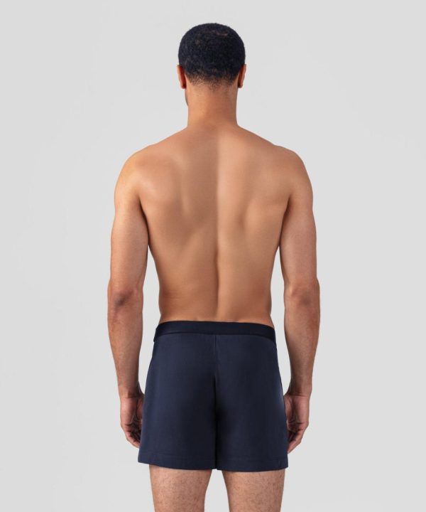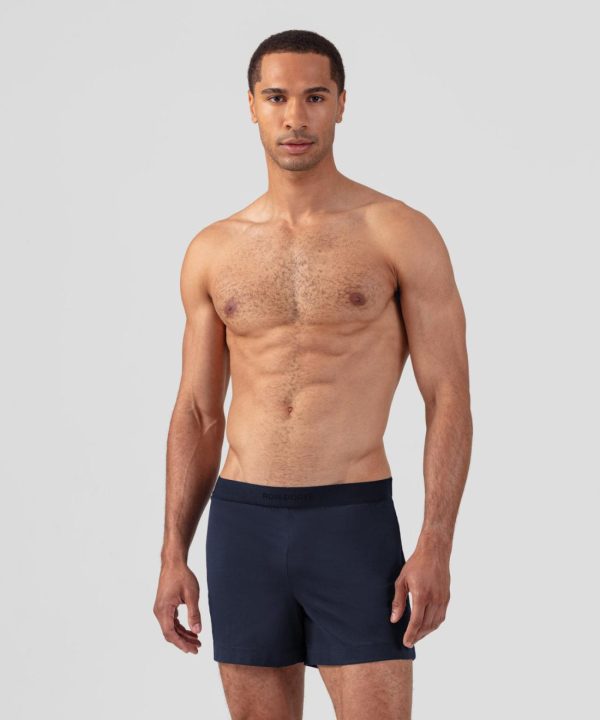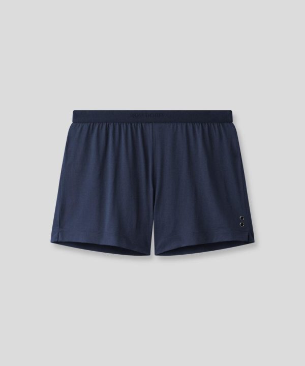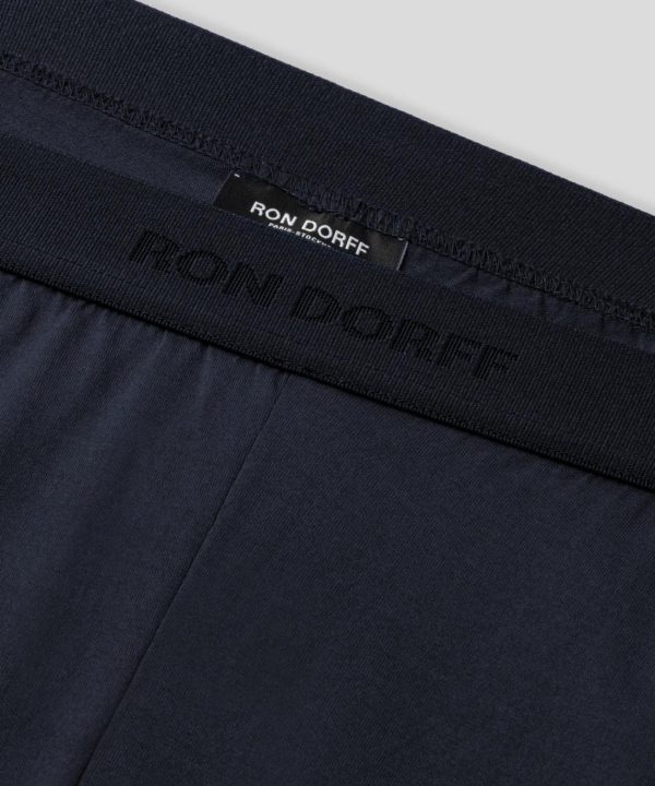 The new pyjama shorts made in 100% ultra-soft cotton jersey with a navy elastic waistband and RON DORFF logo embossed, tone on tone. Ideal for use at home. No back or side pockets and two discrete black-lacquered RD eyelets on the side.