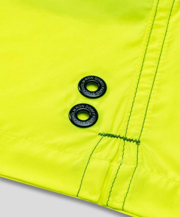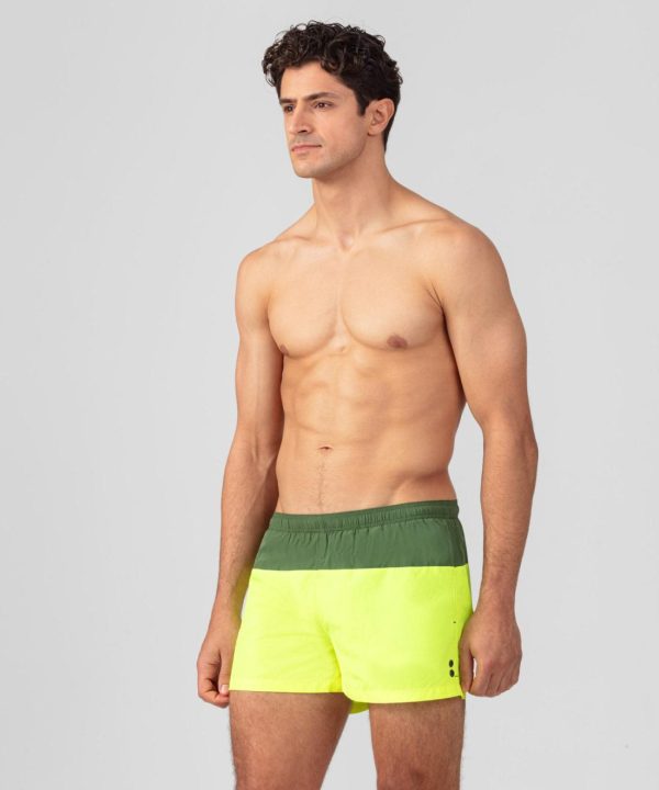 The swim shorts inspired by the model worn around the Mediterranean in the early 80s. The bicolor design adds a vintage touch. Upgraded in an Italian recycled, light-weight and quick-drying polyester. Offering UV and chlorine protection. Breathable micro-mesh lining. Tailored fit, short legs and side slits for an enhanced silhouette. Elastic waistband with adjustable drawstrings. Side pockets and interior key pocket. Featuring the double black-lacquered RD signature eyelets on the side.