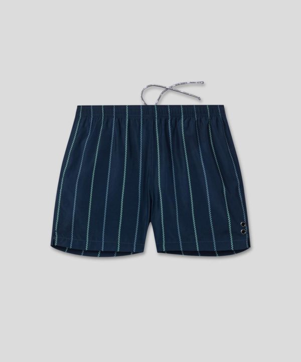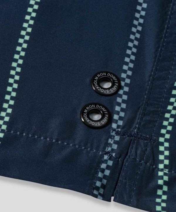 The swim shorts inspired by the model worn around the Mediterranean in the early 80s. Revisited with fisherman stripes. Upgraded in an Italian recycled, light-weight and quick-drying polyester. Offering UV and chlorine protection. Breathable micro-mesh lining. Tailored fit, short legs and side slits for an enhanced silhouette. Elastic waistband with adjustable drawstrings. Side pockets and interior key pocket. Featuring the double black-lacquered RD signature eyelets on the side.