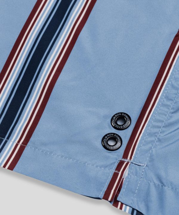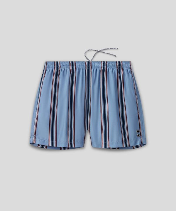 The iconic swim shorts, revisited with irregular stripes inspired by Indian canvases. Upgraded in an Italian recycled, light-weight and quick-drying polyester. Offering UV and chlorine protection. Breathable micro-mesh lining. Tailored fit, short legs and side slits for an enhanced silhouette. Elastic waistband with adjustable drawstrings. Side pockets and interior key pocket. Featuring the double black-lacquered RD signature eyelets on the side.